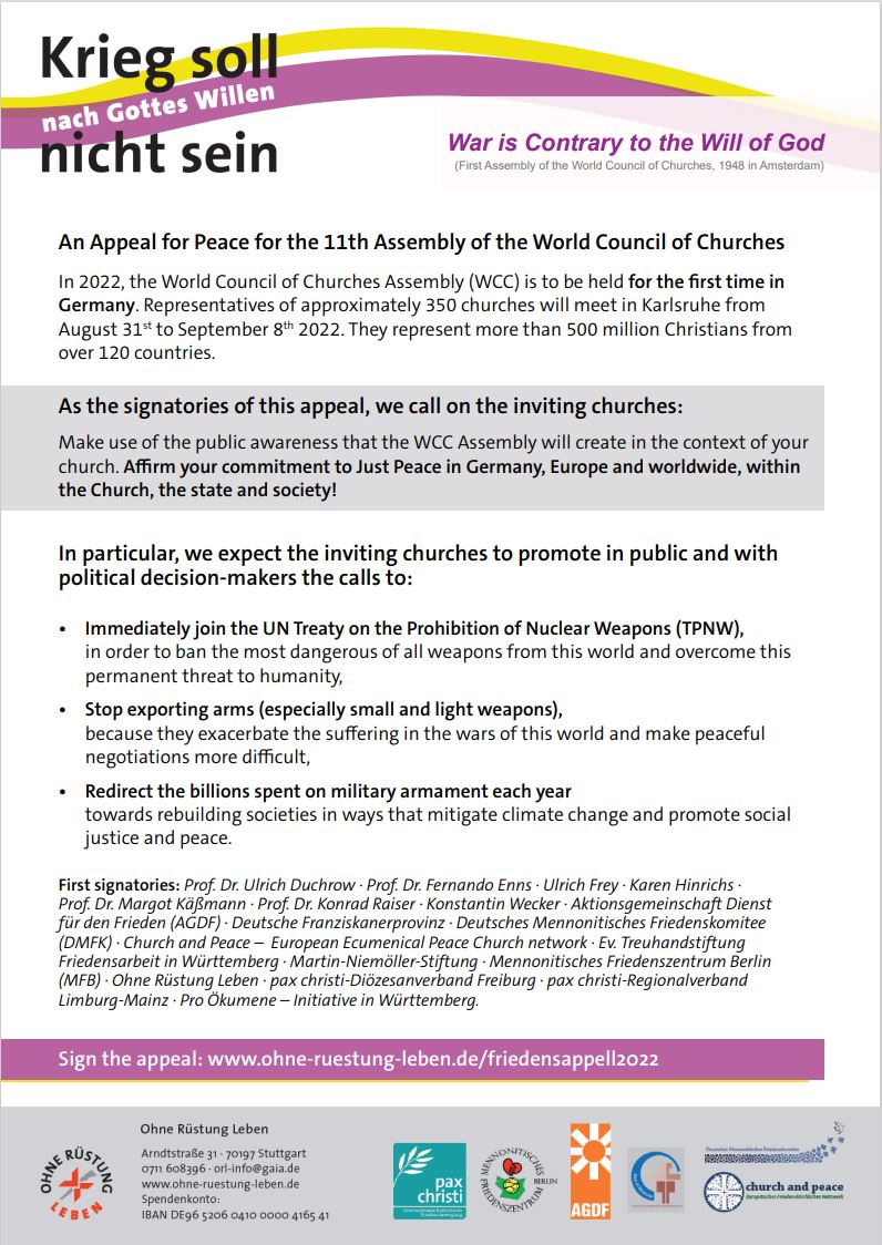 In de aanloop naar de Algemene Assemblee van de Wereldraad van Kerken in Karlsruhe in 2022 nodigen Duitse theologen en oecumenische organisaties kerken wereldwijd uit tot het ondertekenen van een oproep voor vrede.